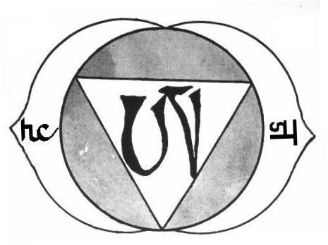 El ramal central coronado con un acento circunflejo invertido (el signo tibetano O) y con un círculo (terminación nasal de M) viene a ser el signo del AUM o de la realización total.